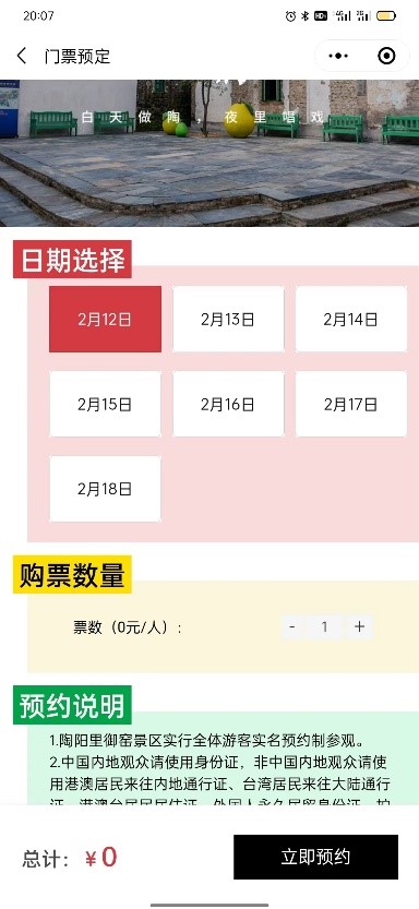 小程序訂票 | 門票預(yù)約 | 可查詢及預(yù)訂當(dāng)日或多日門票 |